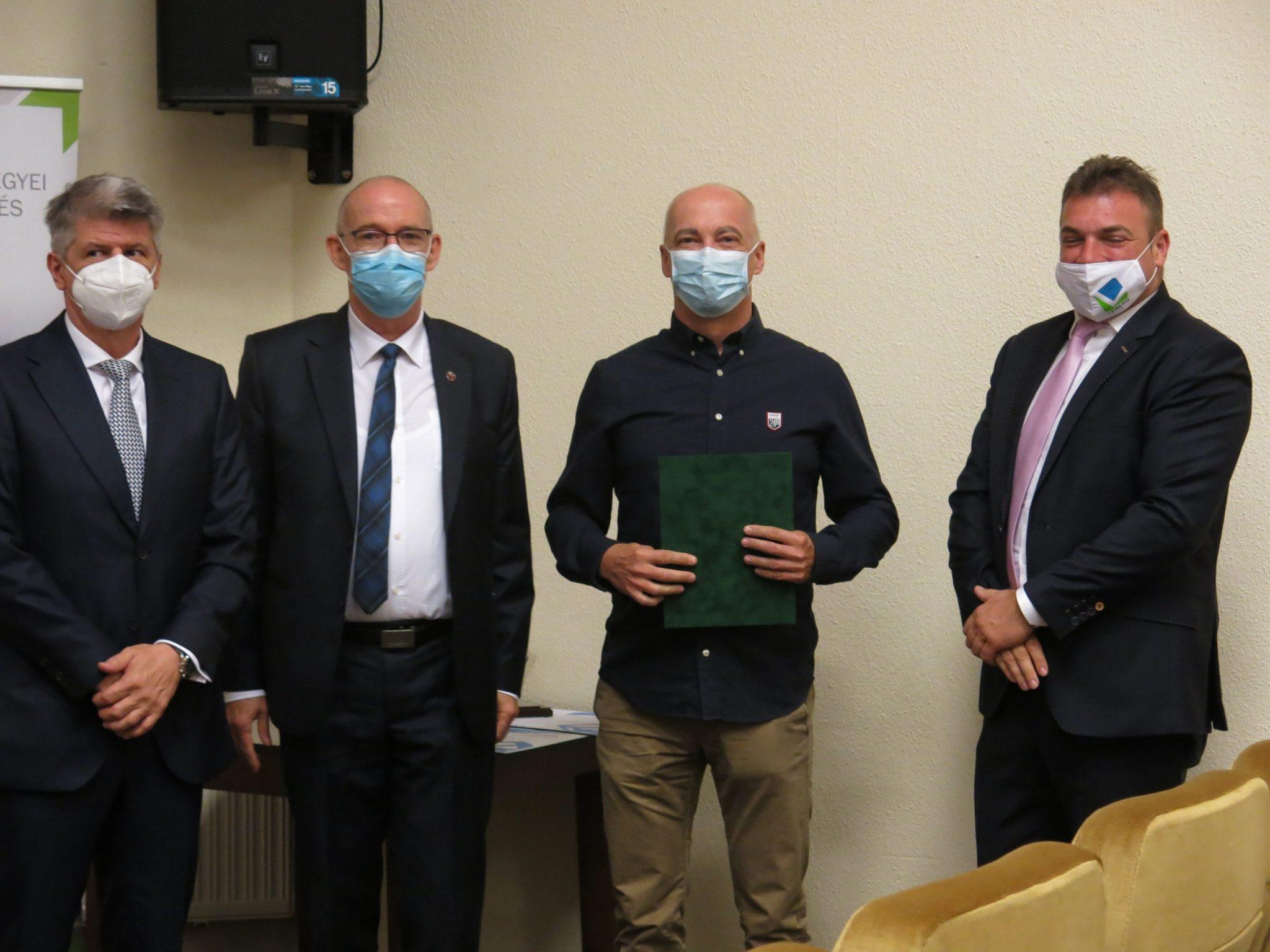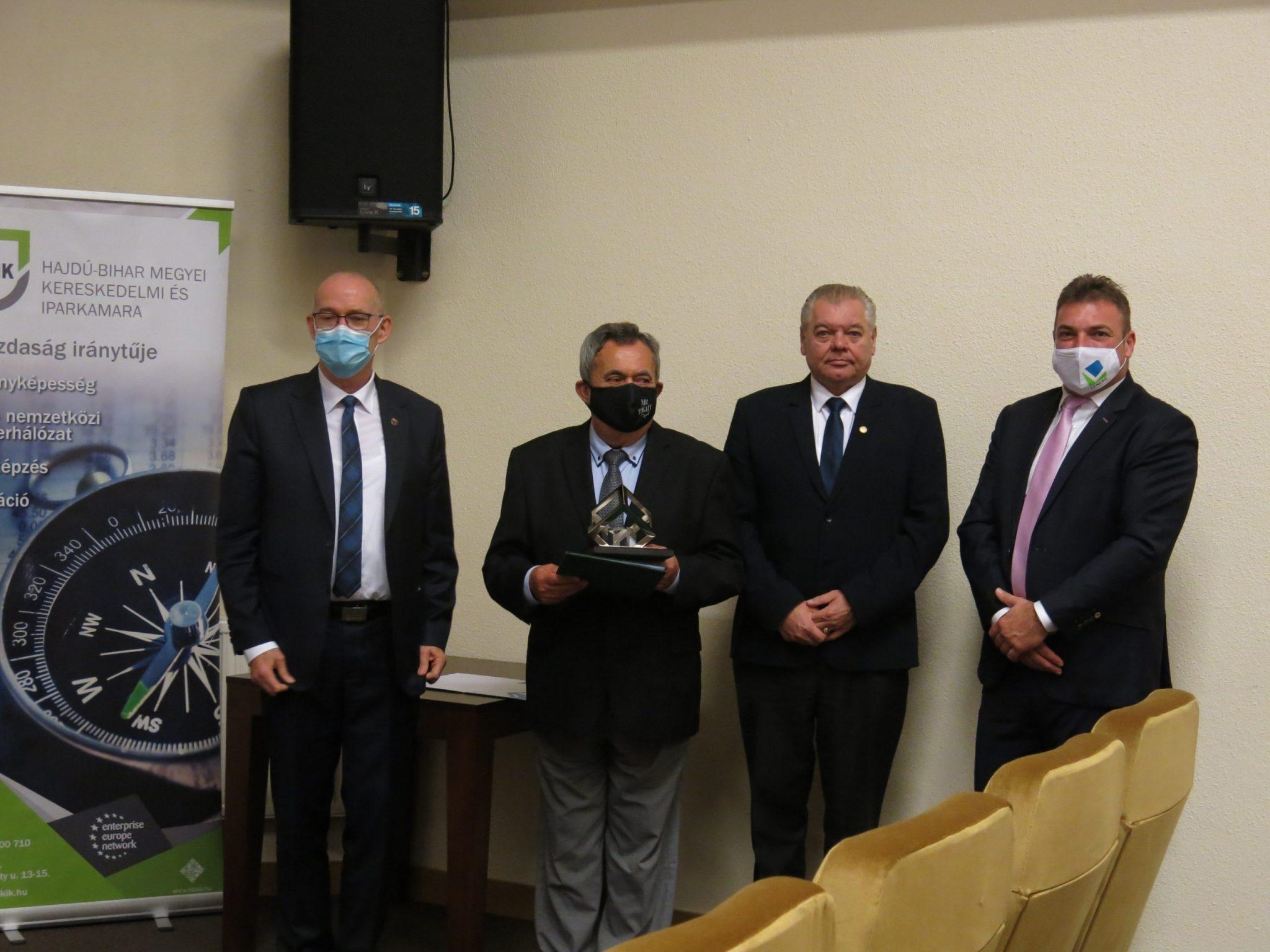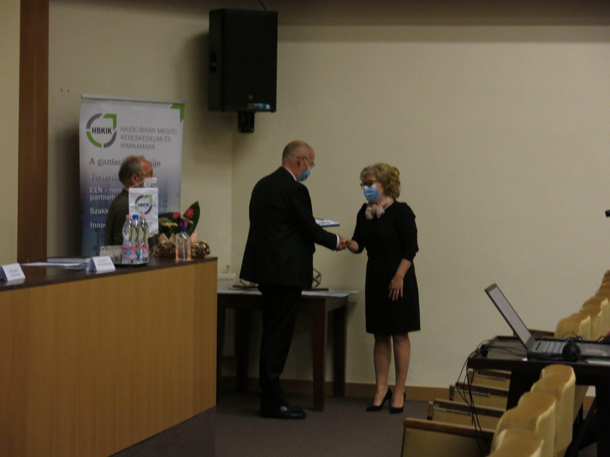 Az Innovációs Díjat Páles Zsolt az MTA DAB elnöke, Nagy Péter a Hajdú-Bihar Megyei Kereskedelmi és Iparkamara ipari tagozati alelnöke és Vámosi Gábor, az INNOVA ügyvezetője adta át Fülöp Leventék, a Trans-Sped Kft. digitális fejlesztési igazgatójának.