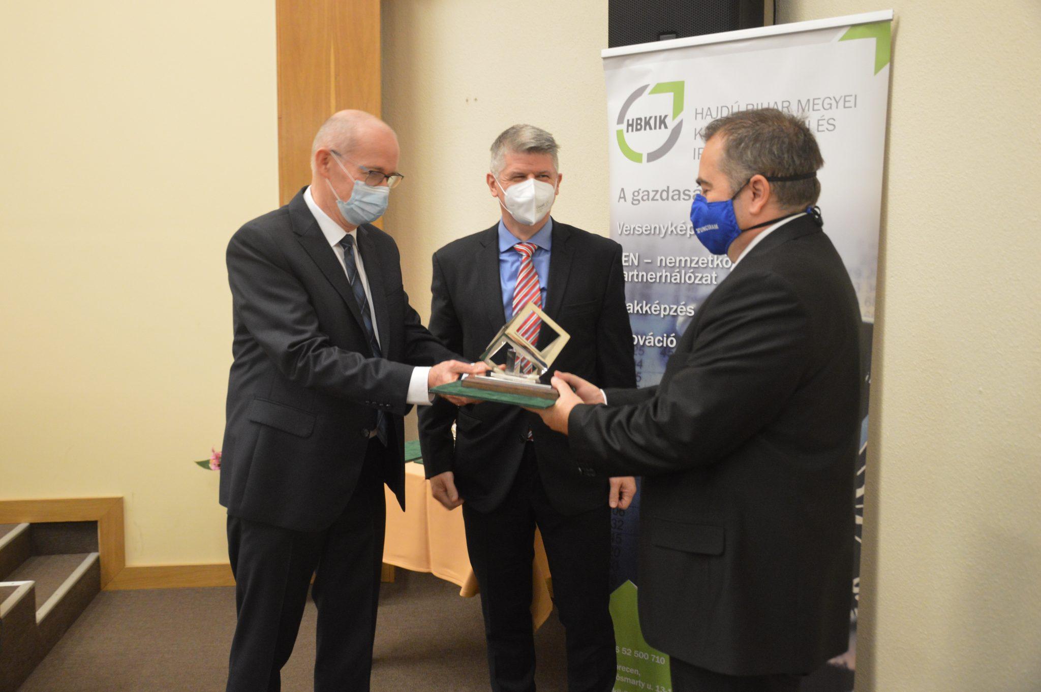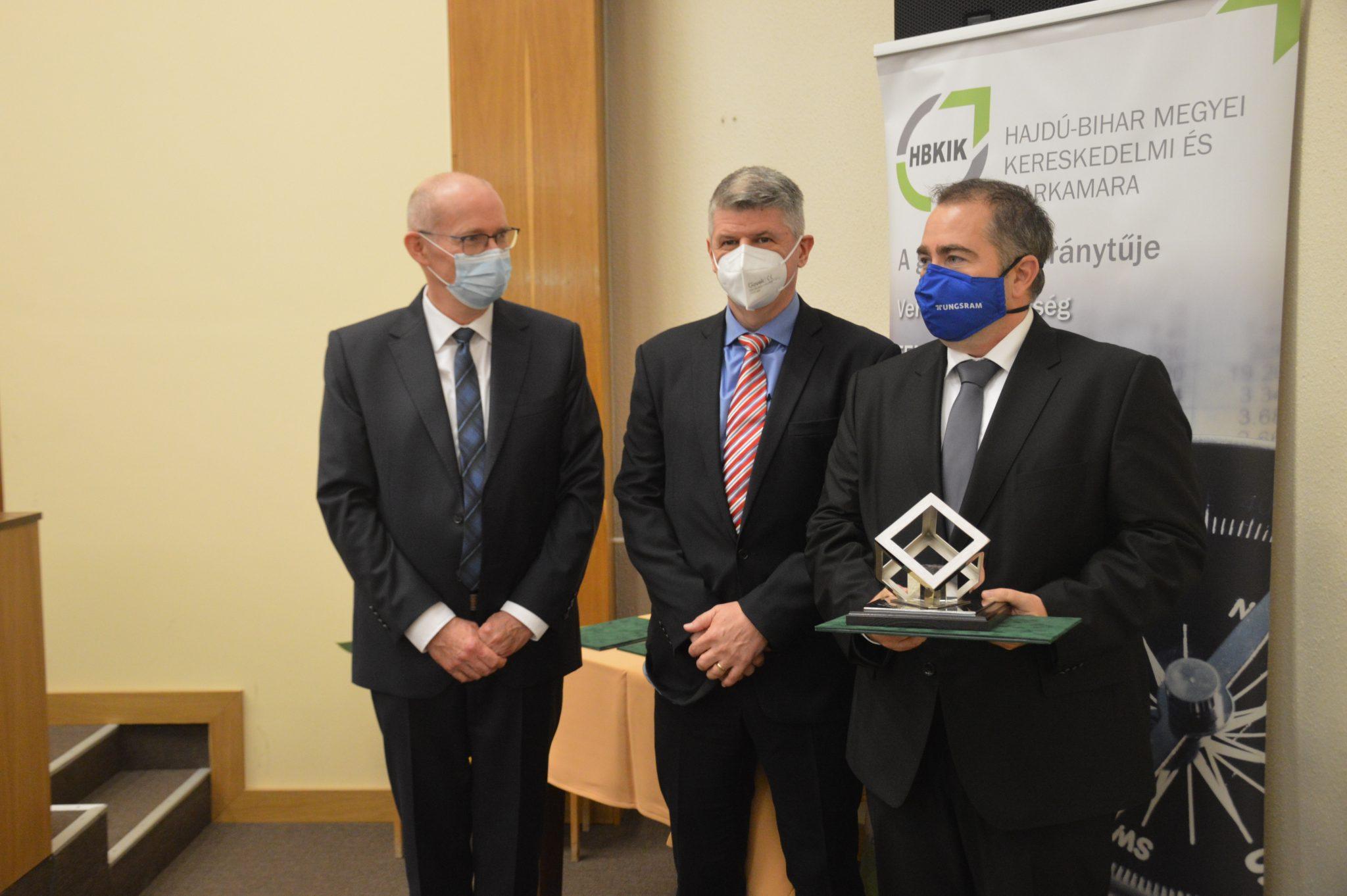 Az Innovációs Díjat Páles Zsolt az MTA DAB elnöke, Nagy Péter a Hajdú-Bihar Megyei Kereskedelmi és Iparkamara ipari tagozati alelnöke és Vámosi Gábor, az INNOVA ügyvezetője adta át Bánhidi Viktornak, a Tungsram Operations Kft. gyárigazgatójának.