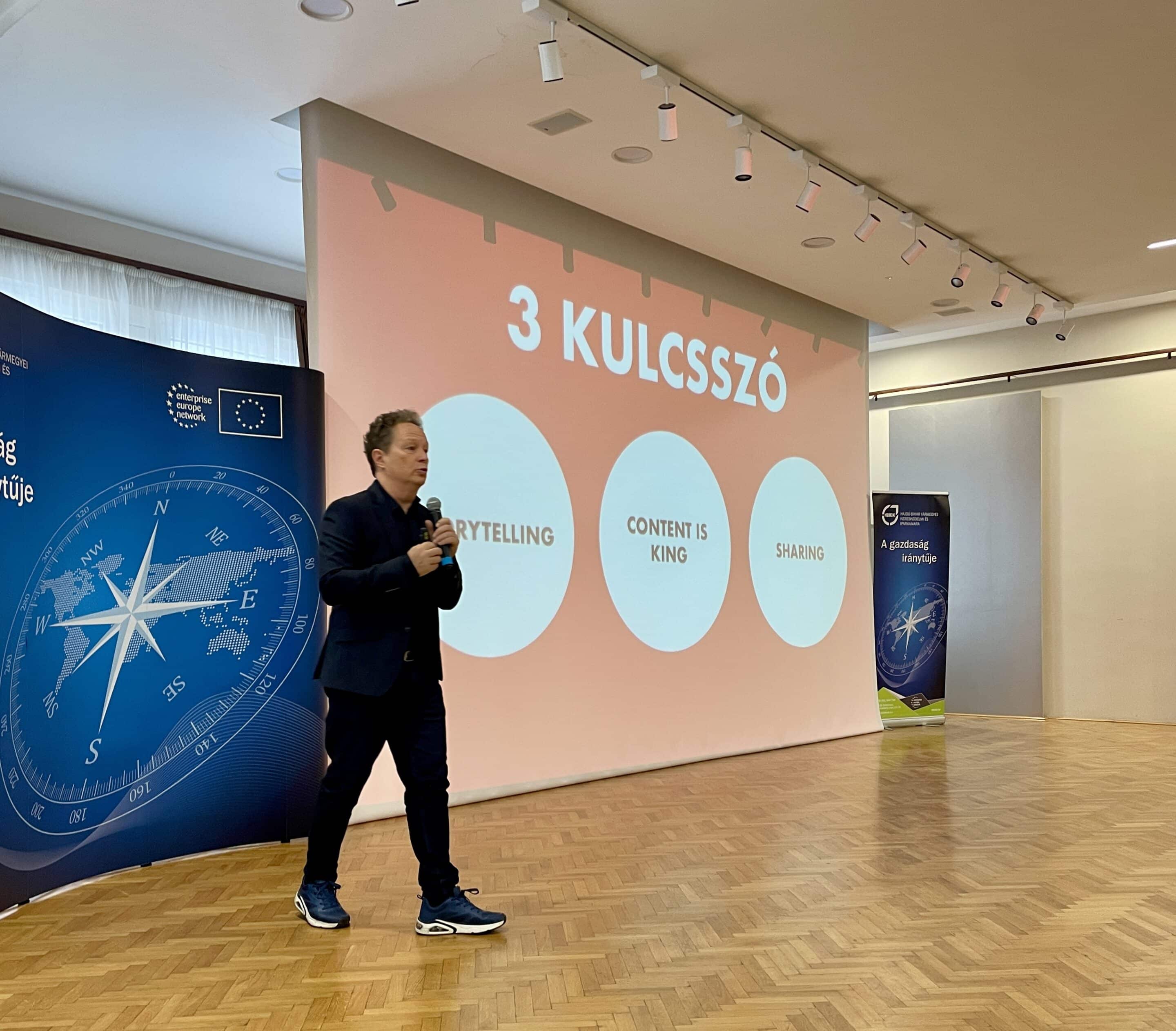 Az előadásában kitért többek között az üzleti gondolkodás, a vezetői erények, a személyes és üzleti jövőkép, az újdonságokra való nyitottság, a változásra való készség, az egészséges pozitív gondolkodás, az önismeret kérdésére is. Szó esett továbbá a közösségi média egyre jelentősebbé váló szerepéről, kiaknázásának lehetőségeiről – a kreatív szakember gyakorlati tippeket, hasznos ötleteket is adott az újabb és újabb marketing eszközök használatához. Pár vállalkozásnak arra is lehetősége nyílt, hogy a reklámszakember weboldalaikat, illetve közösségi oldalaikat előzetes áttekintést követően véleményezze. Bemutatásra kerültek különböző jógyakorlatok, valamint fejlesztendő területek egyaránt.