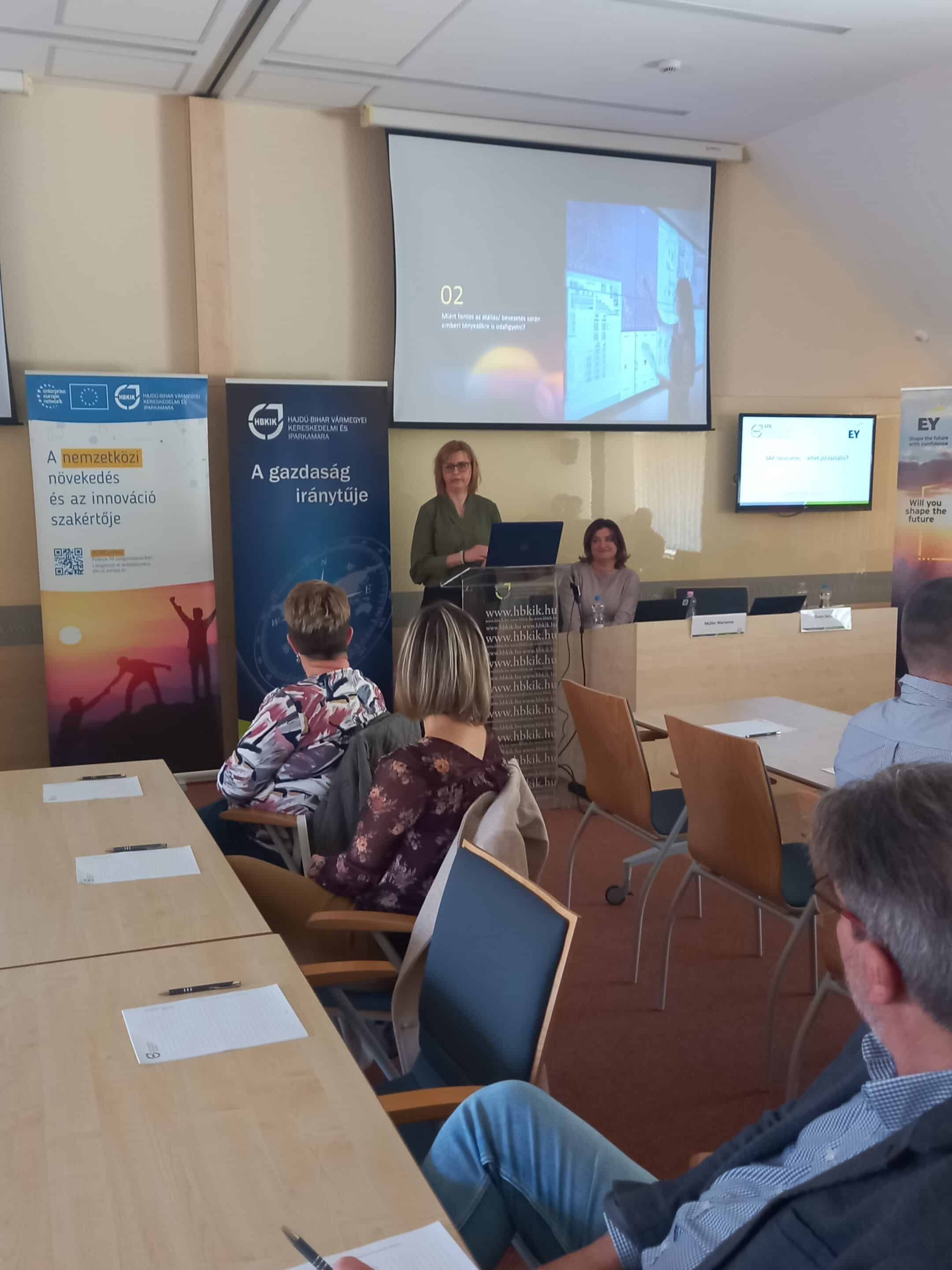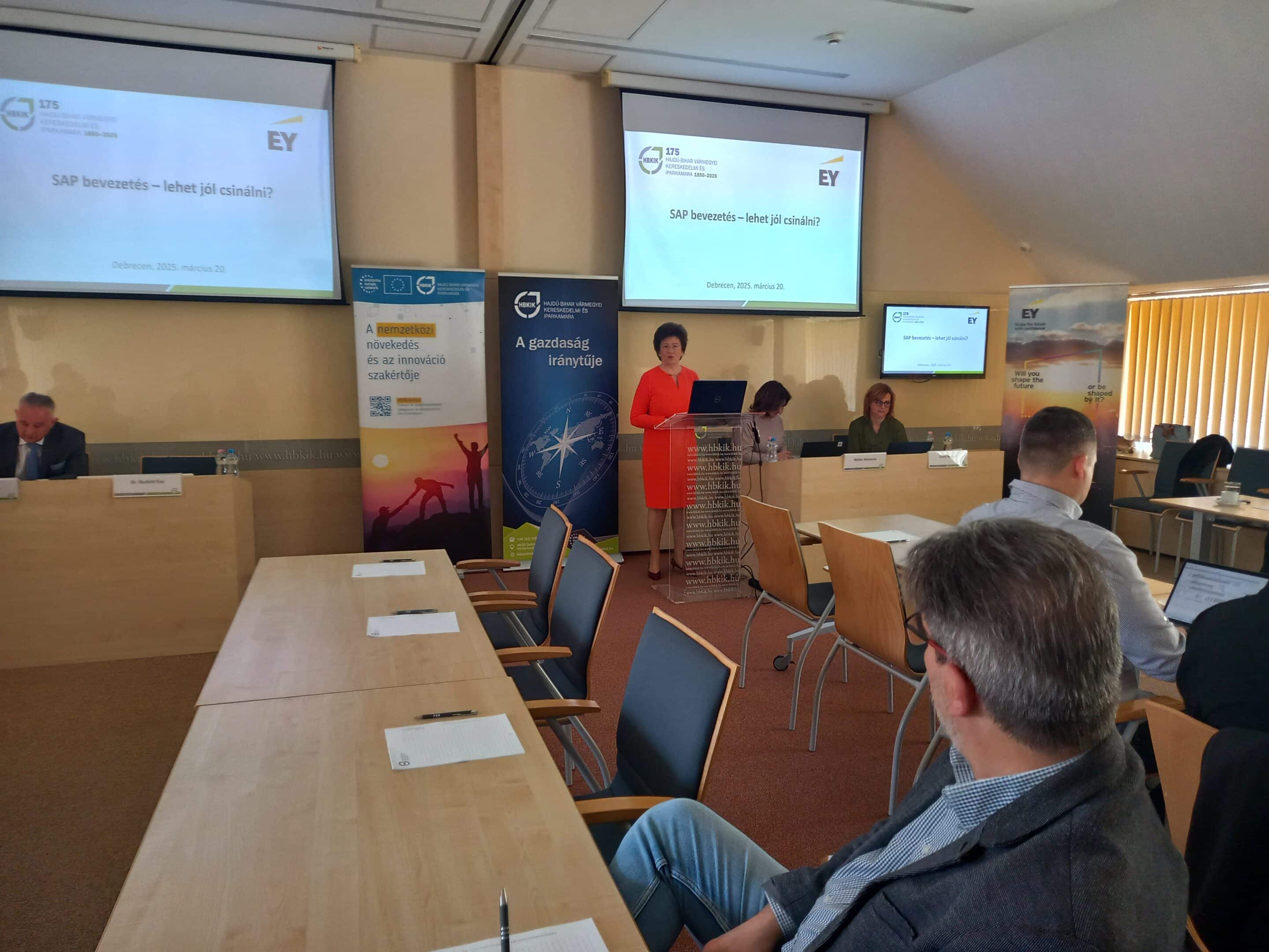 Az EY szakértői, Müller Marianna Senior Manager és Dunn Adrienn Senior Manager előadásaikban átfogó képet adtak az SAP S/4HANA átállás aktuális trendjeiről, a követendő gyakorlatokról, a gyakori hibákról és a változáskezelési kihívásokról. A résztvevők gyakorlati tanácsokat kaptak a technológiai felkészültség, a projektmenedzsment, az optimalizált folyamatok és a változáskezelés területein.