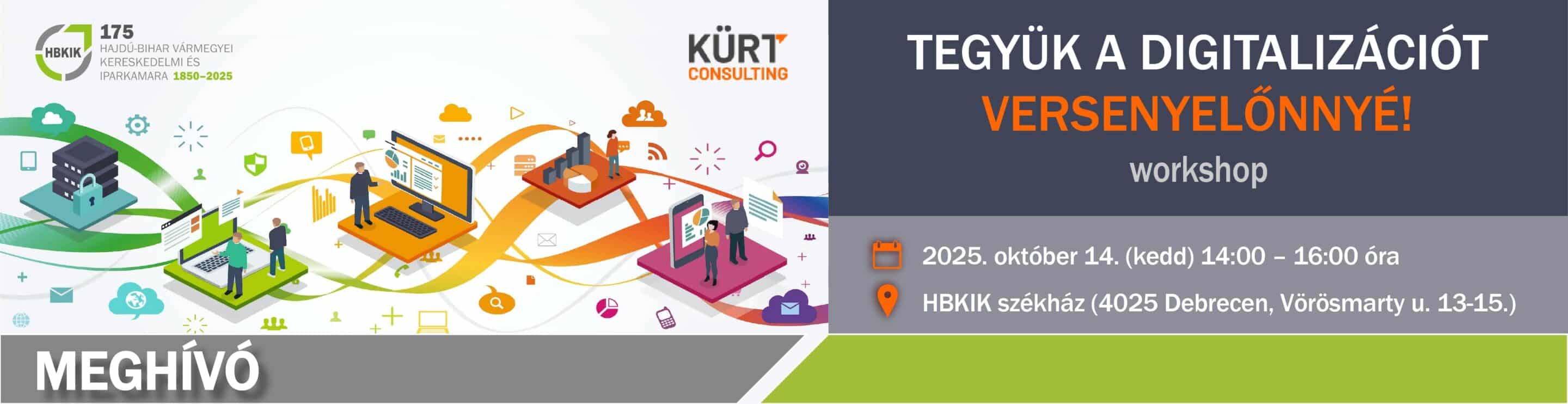 A Hajdú-Bihar Vármegyei Kereskedelmi és Iparkamara és a KÜRT Consulting Zrt. Tegyük a digitalizációt versenyelőnnyé! címmel workshopot szervez.