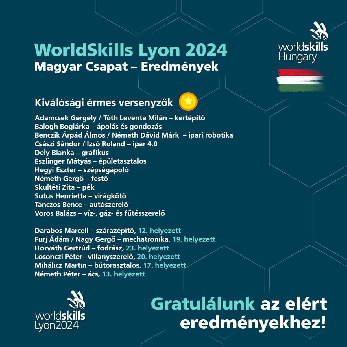 Kitűnő 700 pont feletti teljesítményért további 12 szakmákban vehettek át kiválósági érmet a magyar fiatalok.