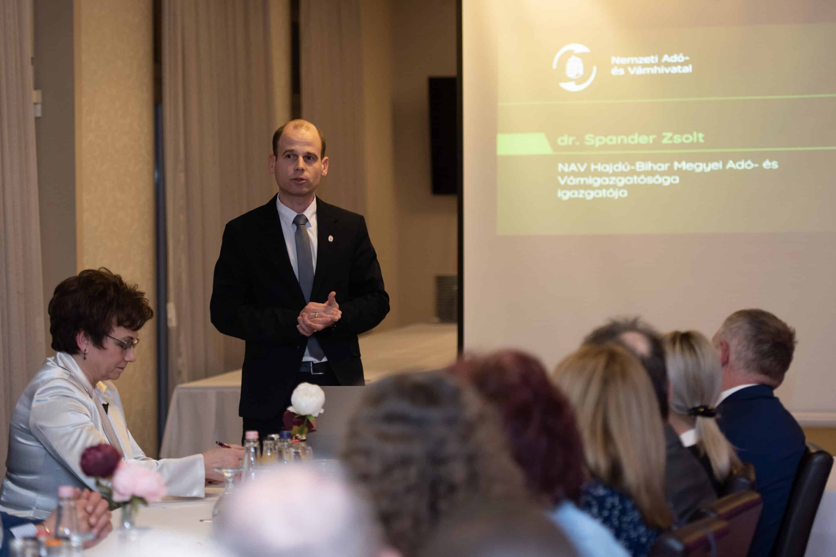 Dr. Spander Zsolt, a NAV megyei igazgatója az adóhivatal számaiból azt olvasta ki, hogy a hajdúböszörményi gazdaságot alapvetően a mikro-, kis- és középvállalkozók viszik a vállukon, hiszen a megye második legnagyobb lélekszámú városában (pontosabban a hajdúböszörményi járásban) csupán négy kiemelt adózó működik. A kkv-k tehát hatalmas növekedési potenciállal bírnak. Az adóhivatali vezető előadásában érintette a legfontosabb jogszabályváltozásokat, majd levetített egy videót arról, ahogy kommandósaik rajtaütnek egy vadonatúj illegális debreceni dohánygyáron, és a tetthelyen lefoglalnak mintegy 850 ezer(!) doboz, zárjegy nélküli cigarettát…