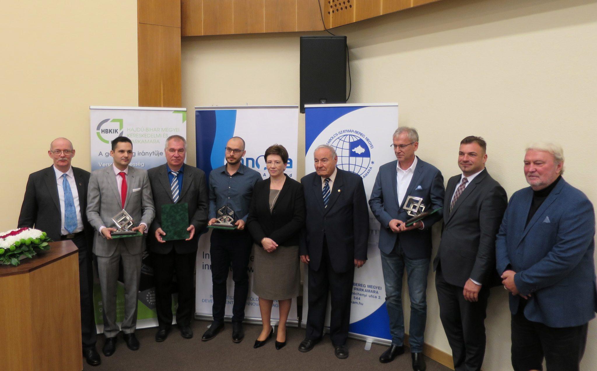 Az Innovációs Díjat Páles Zsolt az MTA DAB alelnöke, Dr. Skultéti Éva a Hajdú-Bihar Megyei Kereskedelmi és Iparkamara főtitkára és Vámosi Gábor az INNOVA ügyvezetője adta át Subert András ügyvezetőnek.