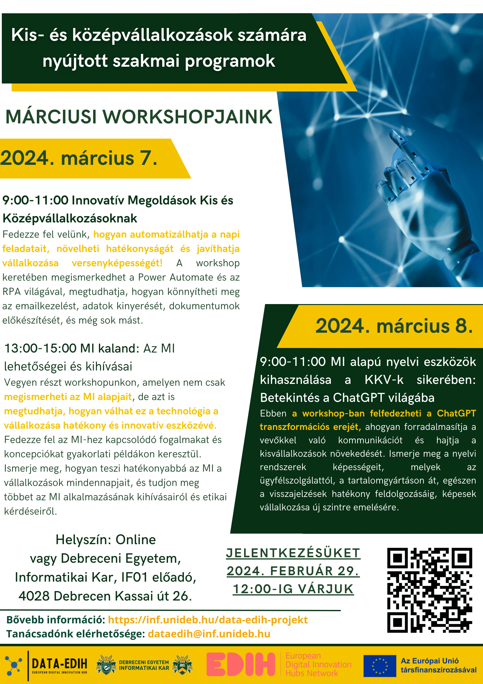 - MI alapú nyelvi eszközök kihasználása a kisvállalkozások sikerében: Betekintés a ChatGPT világába, március 8. 9:00-11:00: