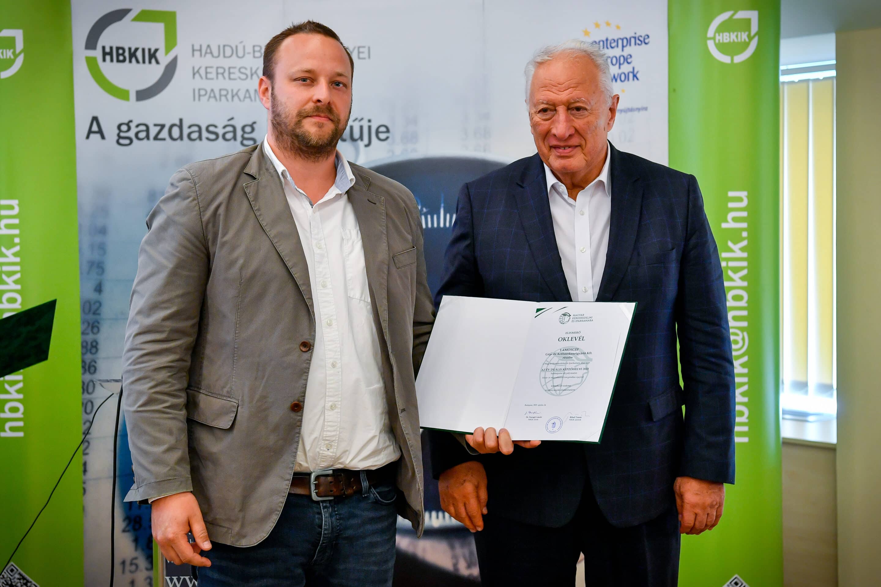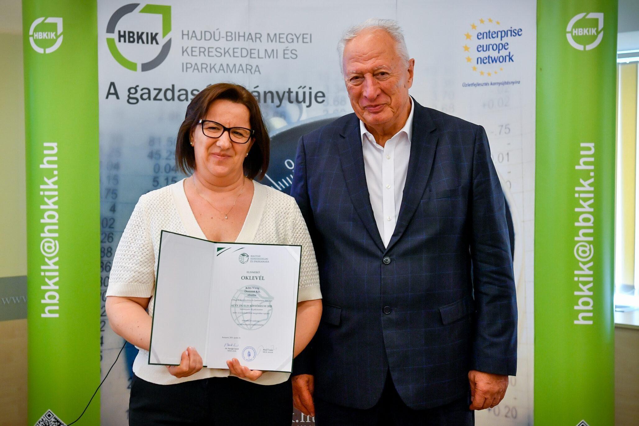 A küldöttgyűlés lezárását követően részesült elismerő oklevélben az a két hajdú-bihari vállalkozás, akik eredményesen szerepeltek a Magyar Kereskedelmi és Iparkamara „Az év duális képzőhelye – 2023” szakképzési díj pályázatán.
