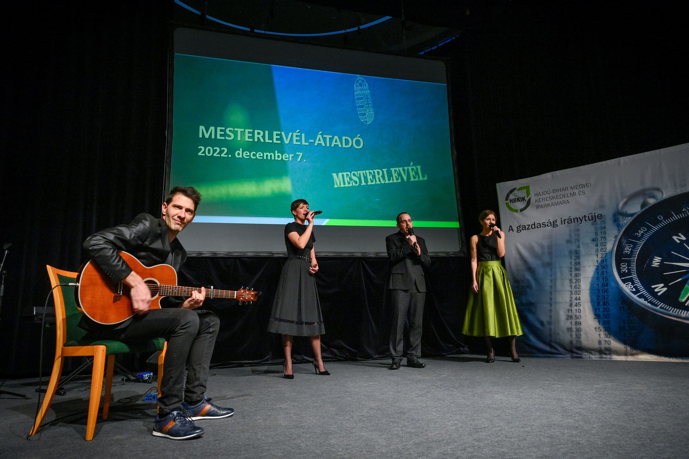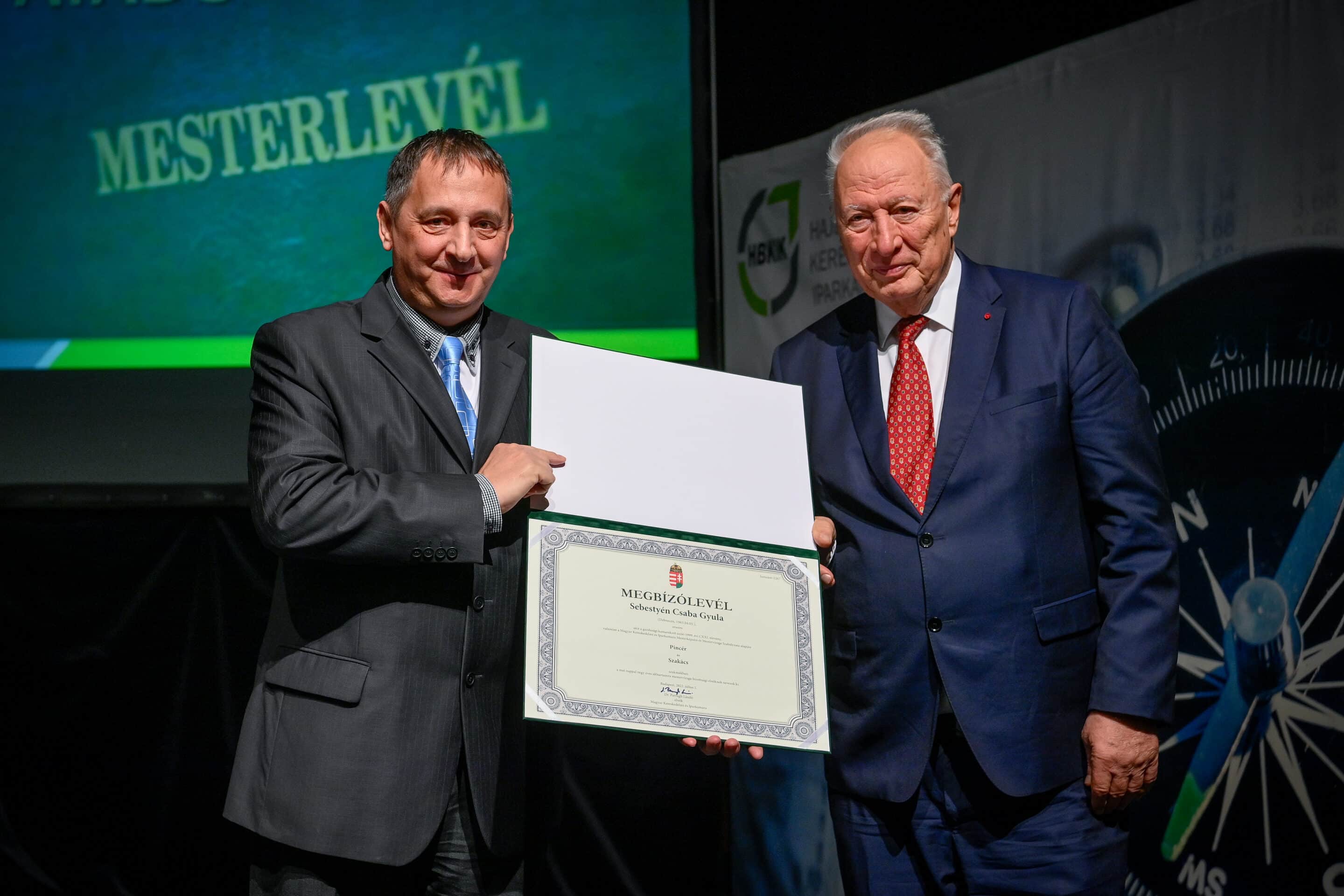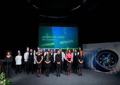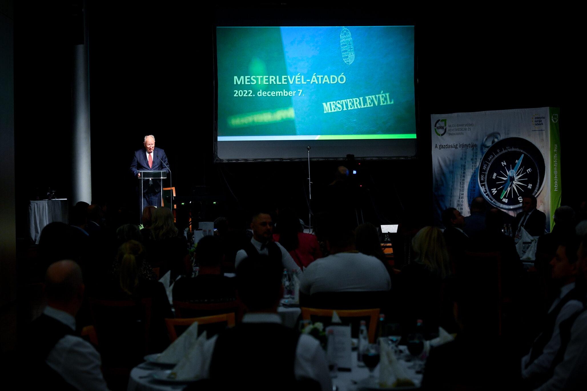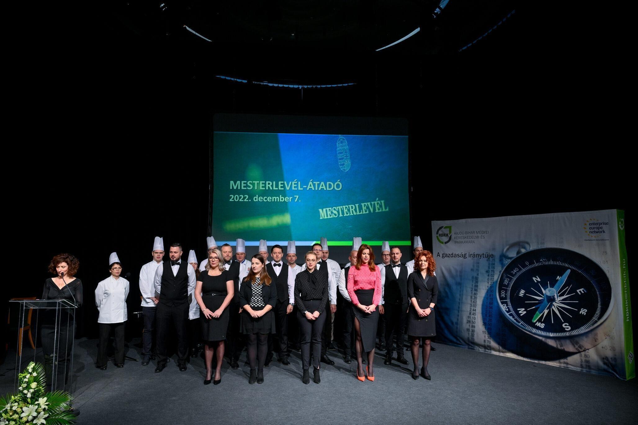 „Egy jó mester a világon is igazít” – Kiss Anna prózájának az utolsó mondata elevenedett meg a Hajdú-Bihar Megyei Kereskedelmi és Iparkamara (HBKIK) mesterlevél–átadó ünnepségén 2022. december 7-én, a debreceni Kölcsey Központ báltermében. Kamaránk idén kozmetikus, pincér és szakács szakmákban szervezett mestervizsgát. Az ünnepi esemény különlegessége, hogy ezúttal aranykoszorús mesterlevél és mesterelnöki kinevezések átadására is sor került.