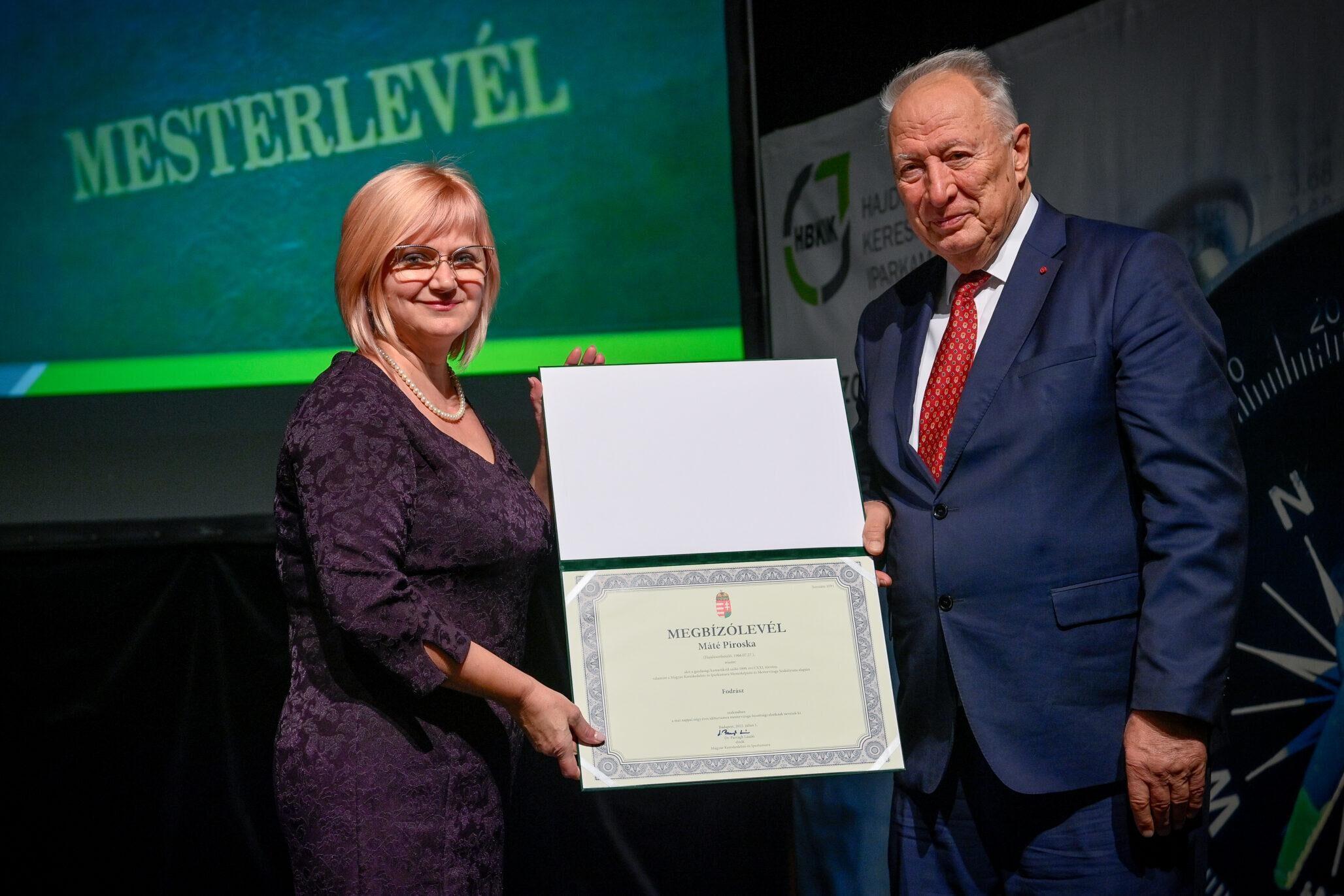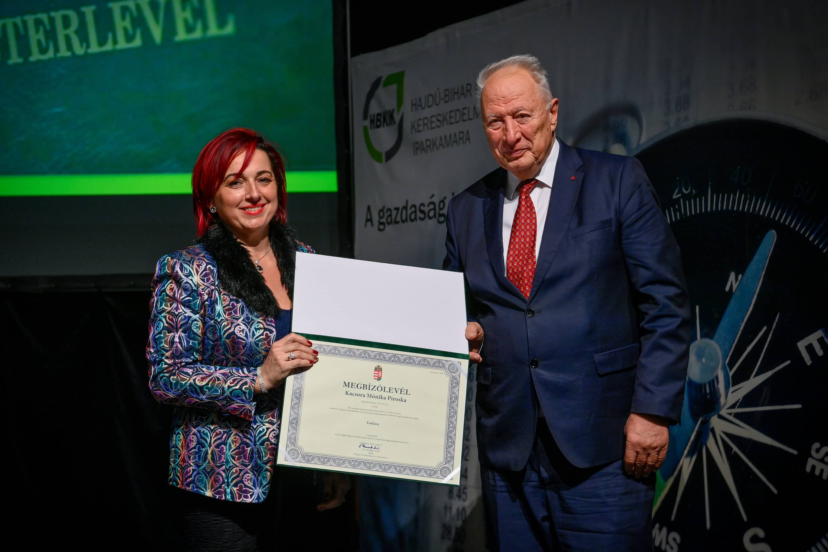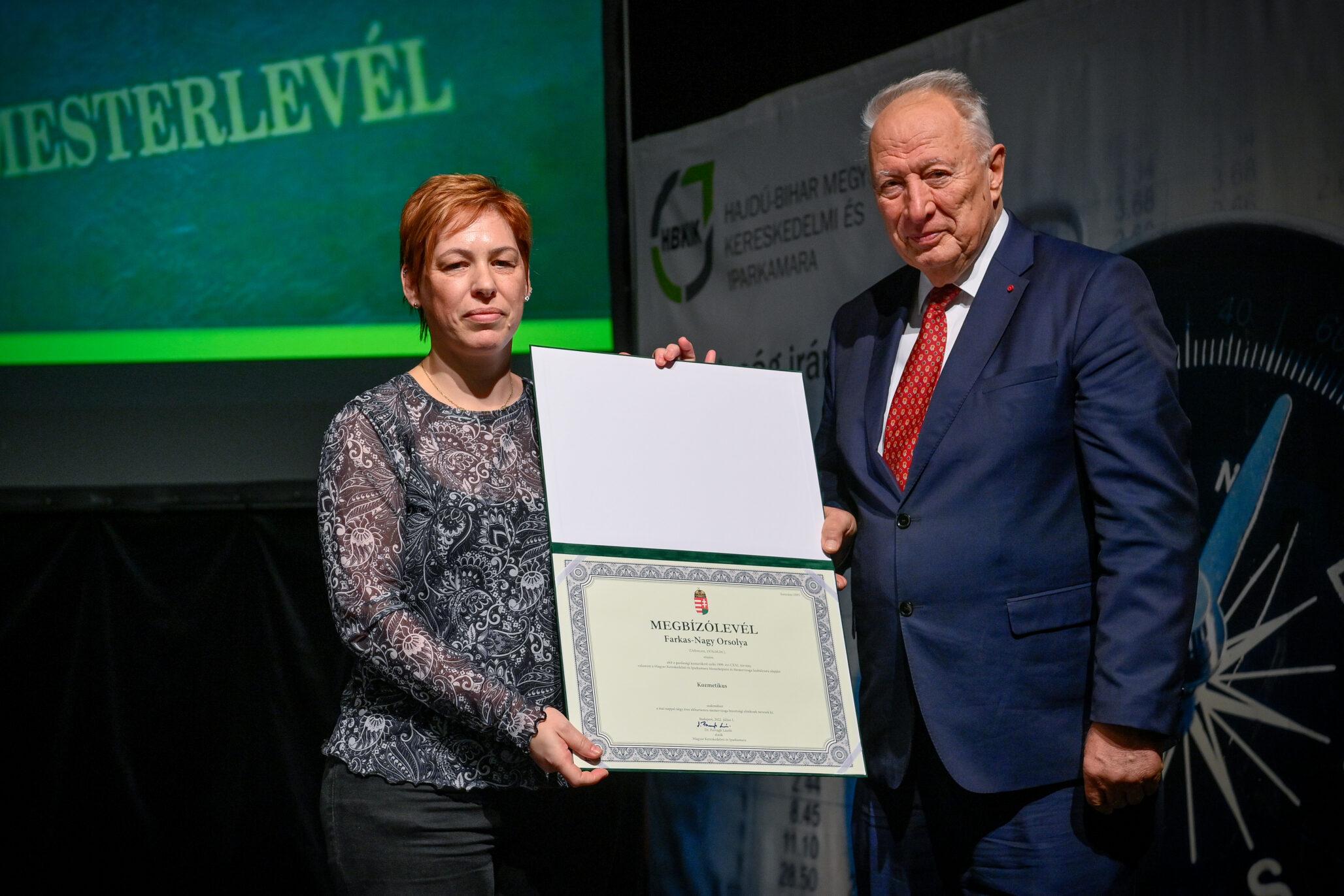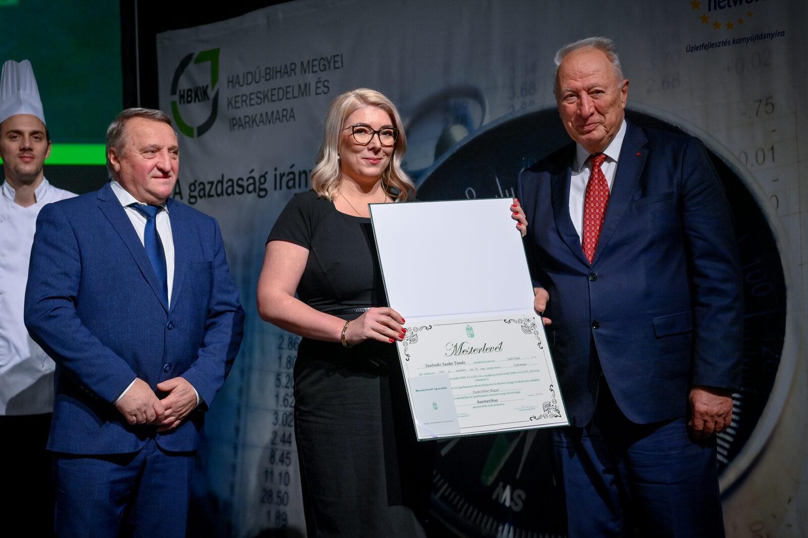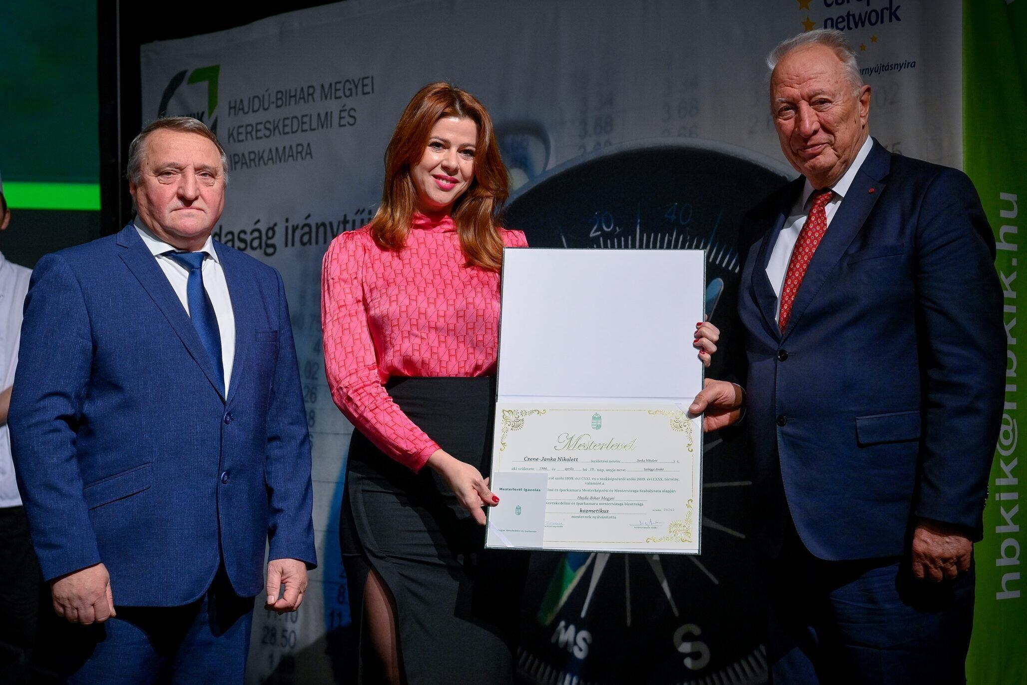 „Egy jó mester a világon is igazít” – Kiss Anna prózájának az utolsó mondata elevenedett meg a Hajdú-Bihar Megyei Kereskedelmi és Iparkamara (HBKIK) mesterlevél–átadó ünnepségén 2022. december 7-én, a debreceni Kölcsey Központ báltermében. Kamaránk idén kozmetikus, pincér és szakács szakmákban szervezett mestervizsgát. Az ünnepi esemény különlegessége, hogy ezúttal aranykoszorús mesterlevél és mesterelnöki kinevezések átadására is sor került.