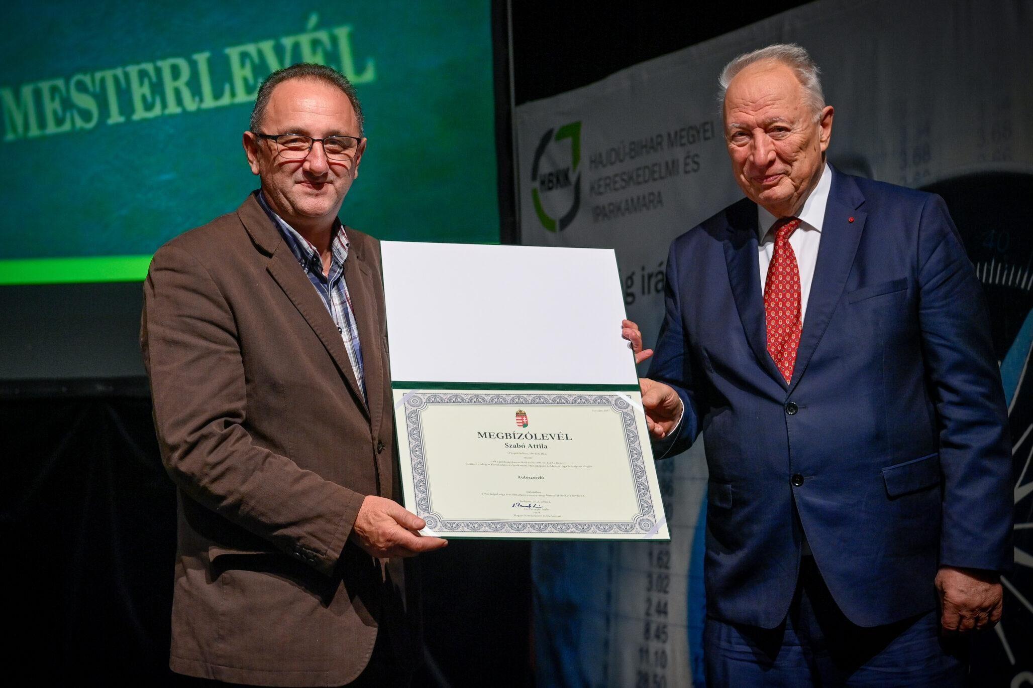 A mesterképzésnek több százéves hagyománya van, melynek égisze alatt idén is egy magas presztízst jelentő mesterlevelet adtunk át. A megyében mostantól 3 szakmában újabb 22 fővel gyarapszik a szakmájukat mesterfokon űzők száma. A mesterség a céhes hagyományokból táplálkozik, hiszen a mesterek egykor a céh teljes jogú tagjai voltak, saját műhellyel, ahol inasokat és legényeket képeztek. A mesterré válásnak szigorú feltételei voltak régen is. A felszabadult legényeknek úgynevezett mesterremeket kellett csinálni, ez a munka pedig esetenként egy évig is eltartott. A céh mesterkönyvébe bekerült mesterek különféle kiváltságokat élveztek, ismert és elismert tagjaiként a közösségnek – idézte meg a dicső múltat Miklóssy Ferenc, az HBKIK elnöke, hangsúlyozva, hogy napjainkban a duális képzés sem lehetne sikeres a szakmájukat magas szinten űző és a tudásukat a következő generációknak átadni képes mesterek nélkül.