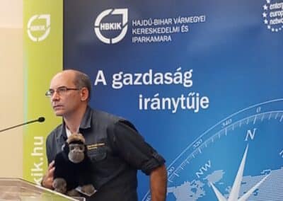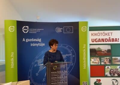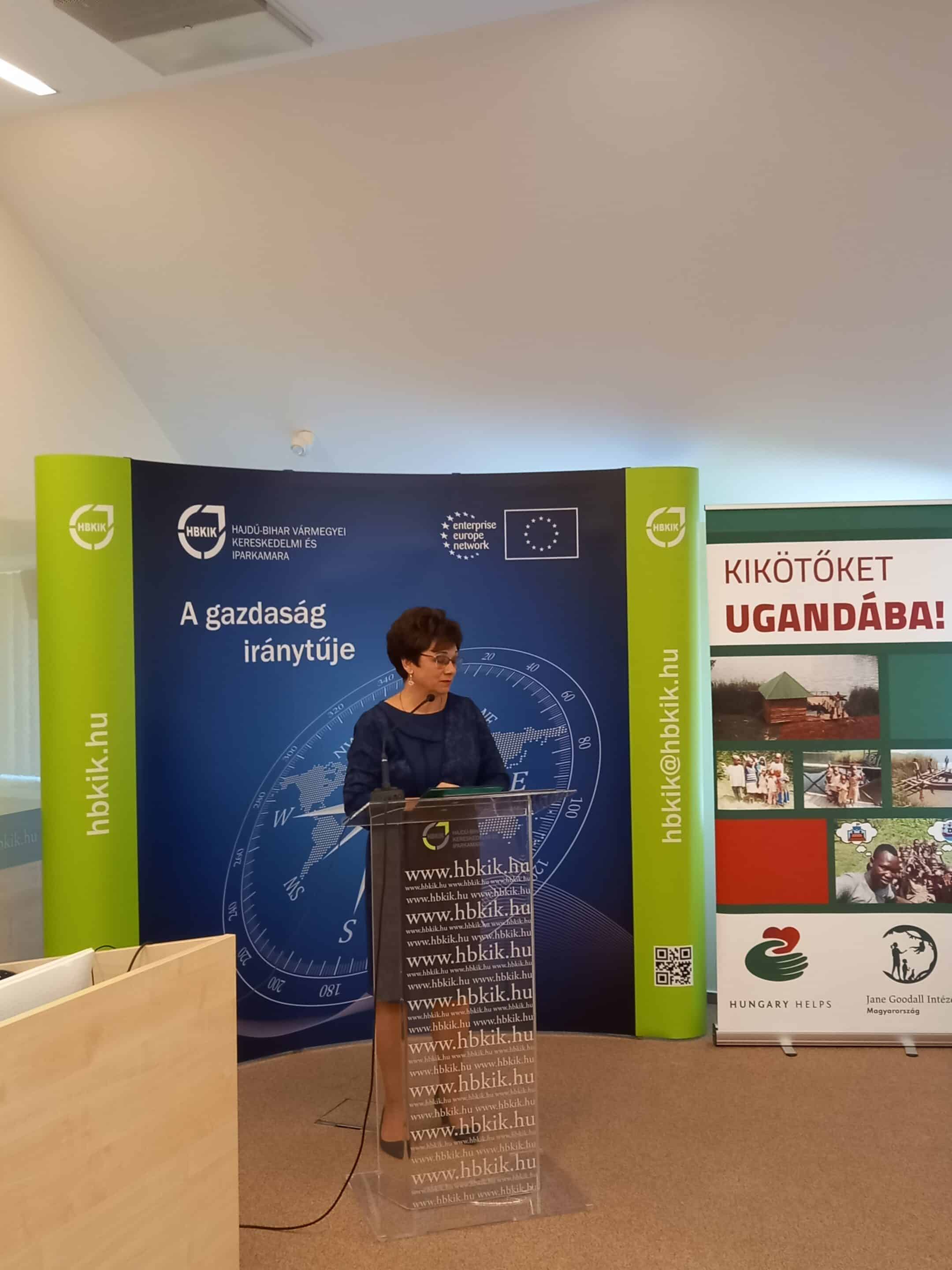 Kathiné Juhász Ildikó, a HBKIK vidéki alelnöke köszöntőjében úgy jellemezte Dr. Jane Goodallt, mint egy olyan tudóst, aki az egész életét utazással töltötte, azonban ezek az utazások soha nem öncélúak voltak. Afrikai kutatói munkája során fedezte fel azt, hogy a csimpánzoknak is lehet egyedi személyiségük, érzelmeik, kapcsolataik. Említést érdemel azon törekvése is, ami az oktatás és a motiválás terén nyilvánul meg, és ezáltal a fiatalabb nemzedékhez tartozókhoz hozza közelebb az említett értékeket. Kutatásainak eredménye napjainkra beépült a tudományos világba. Kamaránk elkötelezett a társadalmi felelősségvállalás iránt, ezért is vállaltunk partnerséget 4 éve a Jane Goodall Intézettel. Sikeres közös kezdeményezésnek bizonyult például a „Passzold vissza, Tesó!” program, melynek keretében a begyűjtött használt mobiltelefonokért befolyt összegből afrikai természetvédelmi őröknek vásároltak esőkabátot és gumicsizmát…” – fogalmazott a Kamara vidéki alelnöke.