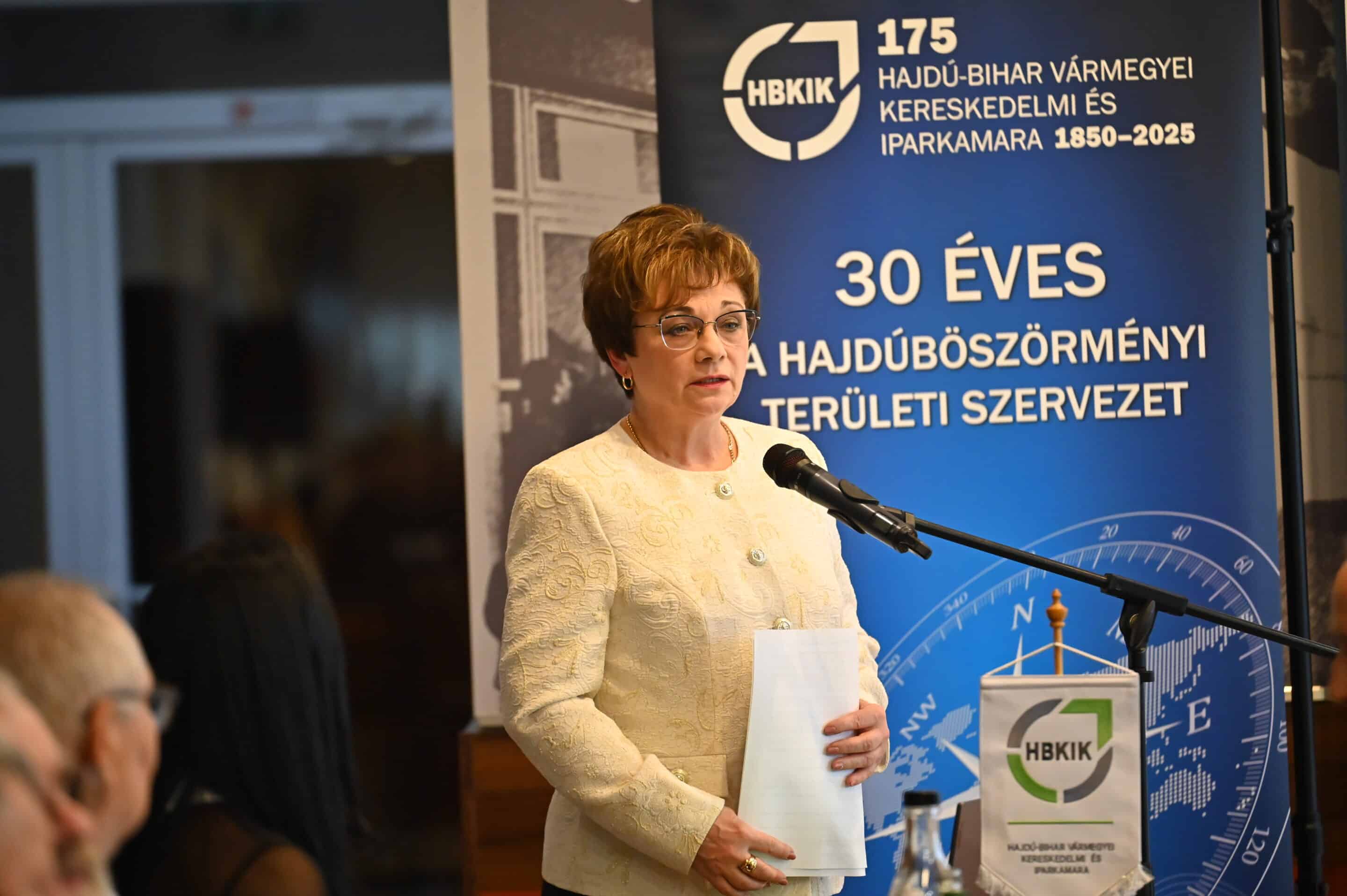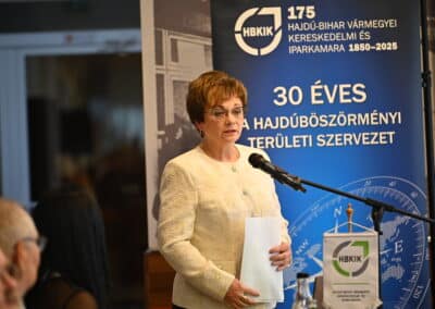 Miklóssy Ferenc, a Hajdú-Bihar Vármegyei Kereskedelmi és Iparkamara elnöke köszöntőjében kiemelte, hogy a hazai vállalkozásokra minden jel szerint kemény idők jönnek. „Lehet bármit mondani, a valóság az, hogy a mindenkori kormánynak a vállalásai teljesítésére annyi pénze van, amennyit a vállalkozók megtermelnek. Igaza volt annak a francia politikusnak, aki úgy fogalmazott, hogy a vállalkozók elé piros szőnyeget kell teríteni, mert csak azt a pénzt tudjuk elkölteni, amit ők a nagy közösbe betesznek. Térségünkben lassan elfogy a szabad munkaerő, ami pedig még rendelkezésre áll, az sok esetben bizony nem elég hatékony. Belátom, hogy a hatékonyság növelése nagyon strapás folyamat, tanulni kell hozzá, de nem lehet megkerülni. A másik gyenge pontunk a kedvezőtlen demográfiai mutatókban rejlik. Csak idén 50 ezerrel többen érik el a nyugdíjkorhatárt, mint amennyien a munkaerőpiacra frissen belépnek. És ez az olló egyre szélesebbre nyílik…”.