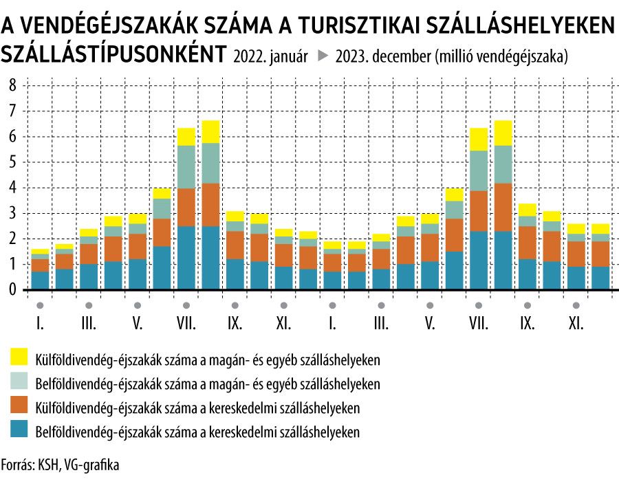 Mutatós statisztikával búcsúzott az előző év a turizmusban, amikor a turisztikai szálláshelyeken a vendégéjszakák száma 13, a vendégeké 16 százalékkal nőtt 2022 decemberéhez képest. Az éves mérleg szerényebb, de stabil pluszt tükröz, a vendégéjszakák száma 2,5 százalékkal haladta meg az egy évvel korábbit. Kiemelkedő mértékben, 12 százalékkal nőtt a külföldi vendégforgalom, a belföldi viszont 5,1 százalékkal csökkent tavaly a KSH friss gyorsjelentése szerint. A szálláshelyek éves árbevétele 15 százalékkal haladta meg az előző évit folyó áron.
