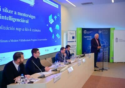A szakmai nap második felében „Digitális ébresztő!” címmel gyakorlatorientált, az üzleti folyamatokban is alkalmazható megoldásokat kínáló MI-szemináriumot rendeztek kezdő felhasználóknak, Kerek István AI-szakértő iránymutatásával.
