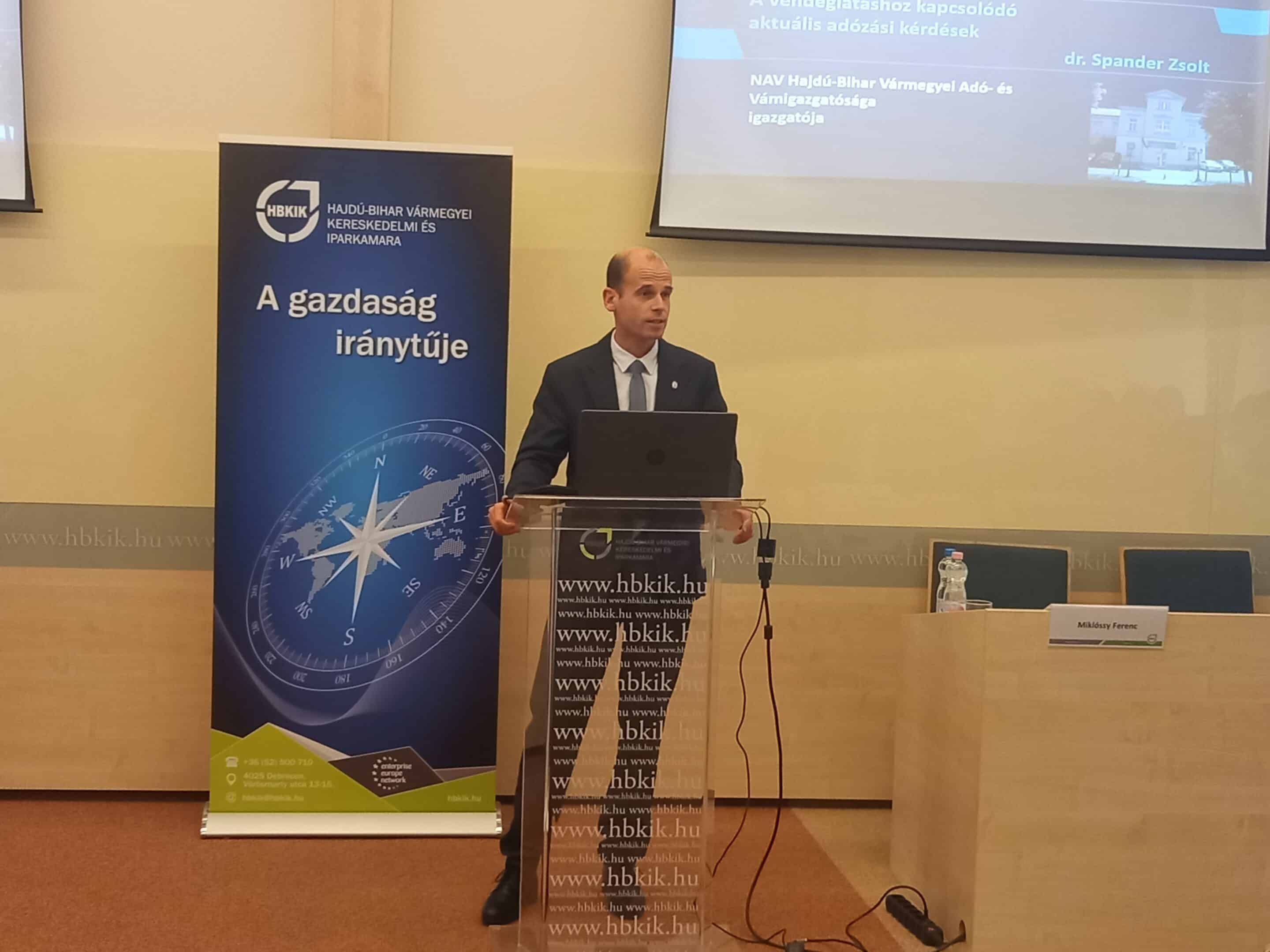 Dr. Spander Zsolt, a NAV Hajdú-Bihar Vármegyei Adó- és Vámigazgatóság igazgatója a rendezvényen a vendéglátáshoz kapcsolódó aktuális adózási kérdéseket ismertette a jelenlévőkkel.